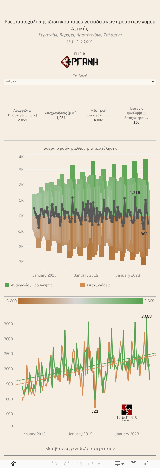 [3] Στο δεύτερο τμήμα του γραφήματος (επιλέγοντας "Μοτίβο αναγγελιών/αποχωρήσεων") διακρίνονται οι θερμικοί χάρτες των ροών της απασχόλησης. Όπως φαίνεται από τα στοιχεία οι προσλήψεις ενισχύονται σταθερά από την άνοιξη προς το καλοκαίρι (Απρίλιος-Ιούλιος) με υψηλές τιμές σχεδόν σε όλα τα έτη μετά το 2016, σύμφωνα με τα μη εποχικά διορθωμένα στοιχεία. Ο Σεπτέμβριος εμφανίζει συστηματικά πολύ υψηλή ένταση (σκούρες αποχρώσεις), υποδηλώνοντας ισχυρό κύμα προσλήψεων μετά το καλοκαίρι ενώ, αντίθετα οι χειμερινοί μήνες (Ιανουάριος-Φεβρουάριος) είναι σταθερά πιο ασθενείς. Από την άλλη πλευρά, οι αποχωρήσεις δείχνουν συγκεντρωμένες κυρίως κατά τους θερινούς μήνες, εμφανίζοντας ισχυρή και σταθερή εποχικότητα, ενώ μετά το 2016 αυξάνονται σε ένταση, αντανακλώντας την υψηλή μεταβλητότητα της αγοράς στην περιοχή.